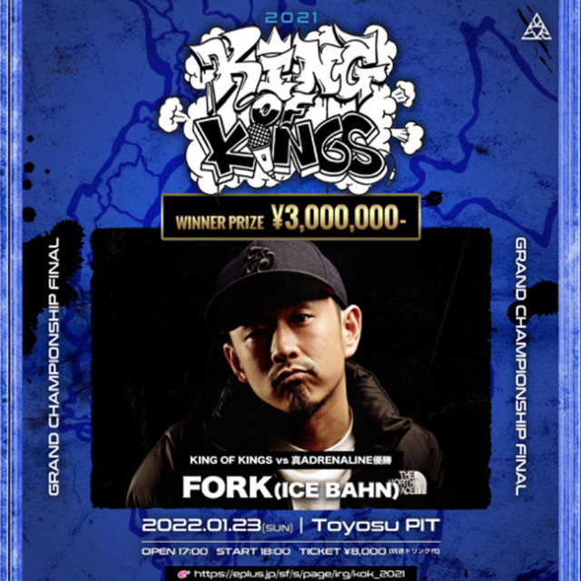 だけど、なんと今年のKing of KingsにICE BAHNのFORKが参戦するっていうじゃないですか。しかも、他のメンバーも錚々たる顔ぶれ。ディフェンディングチャンピオンであり、モンスター仲間でもある呂布カルマもいる。こんな贅沢なメンバーでの大会はそうそうない。