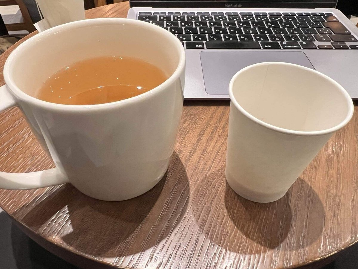 と思ったけど、これまた笑顔が素敵な店員さんだったので断りきれず、今僕の前には間も無く抽出が終わったカモミールティーのマグカップとコーヒーが入った小さな紙コップがあります。