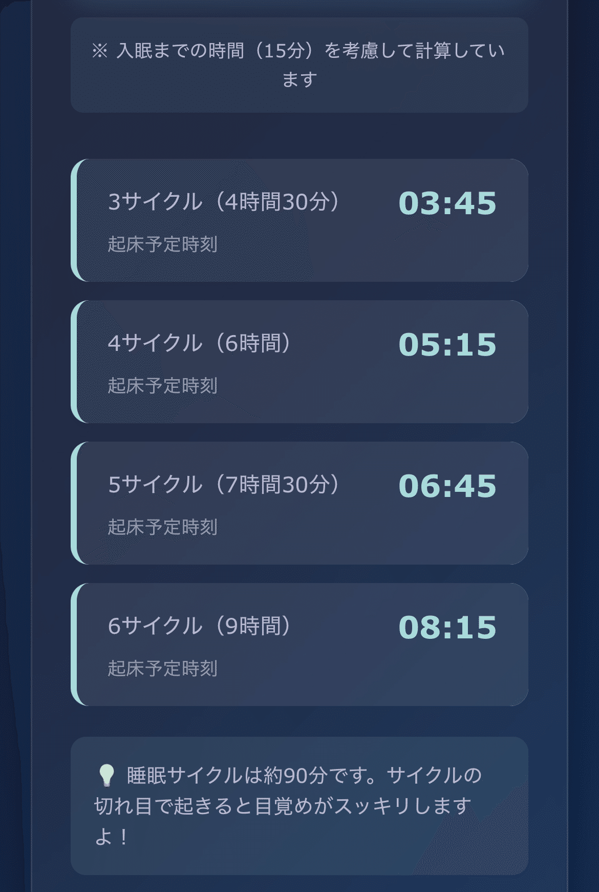 「入眠まで15分〜30分かかるので、この時間も考慮しますか?」とか。「90分単位でレム睡眠とノンレム睡眠を繰り返すので、これをベースに起きる時間を何パターン化してみますか?」とか。
