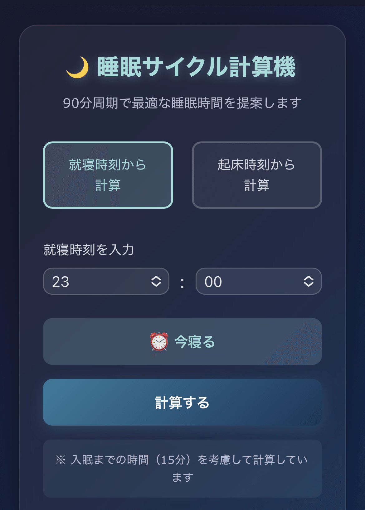 寝る時間がずれた時とか、ちょっと夜更かししちゃった時に、「大体この時間で起きたら何時間くらい寝れるんだろう?」って頭の中で計算するのが面倒で。