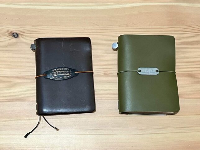 左がトラベラーズノートパスポートサイズのオリーブエディション(1年利用)、右がCollasaroレザーノートXSサイズのオリーブグリーン。光の当たり具合もあるかとは思いますが、かなり色味が違います。